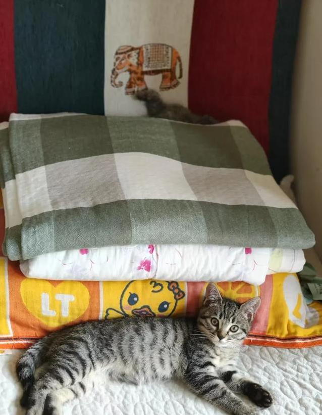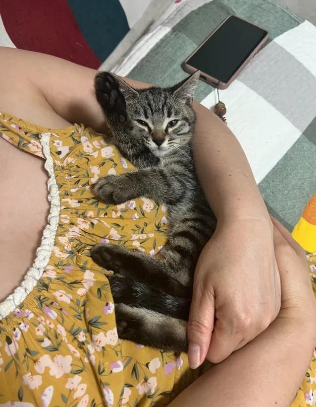 这只奶猫才两三个月大,毛色是漂亮的虎斑纹,像穿了件小花衣裳。它的眼睛大大的,好像会说话,盯着人看的时候,让人心都化了。妈妈看它抖得厉害,立马抱回家,裹上软毯子暖和着。